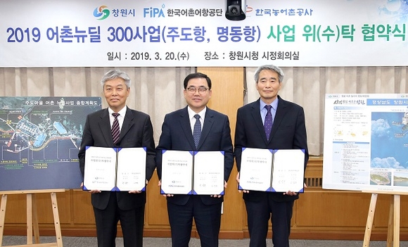 경남 창원시는 20일 시청 시정회의실에서 한국어촌어항공단 및 한국농어촌공사와 사업 위·수탁 협약을 체결했다. 2019년 정부공모사업으로 선정된 어촌뉴딜300사업의 성공적인 추진을 위해서다.