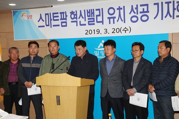 경남 밀양시 농업인단체(밀양시 이장협의회 외 11개 단체)는 20일 밀양시청 브리핑룸에서 '경남 스마트팜 혁신밸리' 유치 성공과 관련해 기자회견을 갖고 적극 환영의 뜻을 밝혔다.