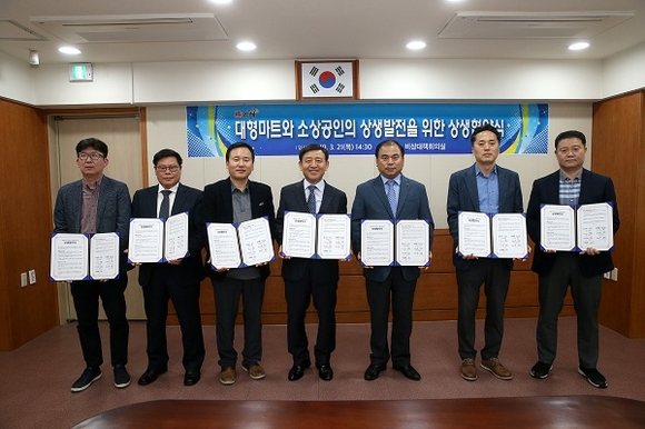 이번 상생협약으로 대형마트 내 일정규모 지역특산물 코너를 개설하고 행사코너에 소상공인 우수제품 납품을 추진하기로 했다. 또 영업장 외 정기 프리마켓 공간을 제공하기로 했다.