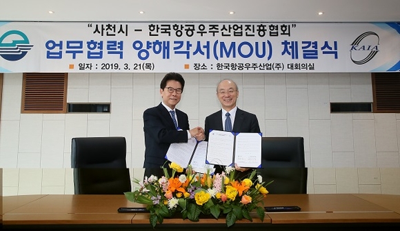 경남 사천시와 한국항공우주산업진흥협회가 21일 한자리에 모여 항공우주산업 육성과 발전을 위한 업무협약식을 가졌다.