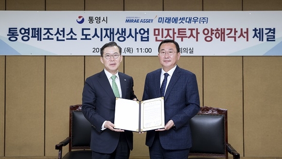 경남 통영시와 미래에셋대우(주)는 21일 통영 폐조선소 재생사업의 성공적인 추진을 위해 '통영폐조선소 재생사업 민자투자 양해각서'를 체결했다.