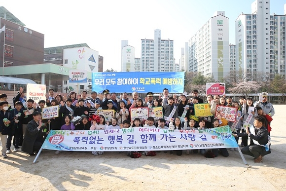 또한 박종훈 교육감, 김창룡 경남지방경찰청장, 이삼희 경남도청 행정국장 등 유관기관의 기관장을 비롯한 학생, 학부모 200여 명이 학교폭력 근절과 예방에 대한 강한 의지를 담은 퍼포먼스를 펼쳤다.