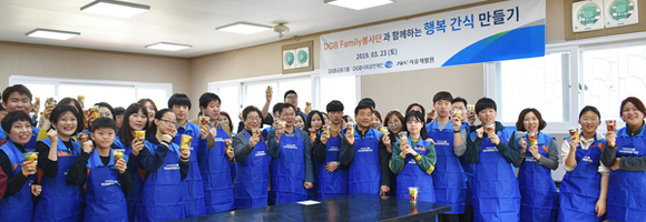 DGB금융그룹은 지난 23일 대구 동구 덕공동 지적장애인 거주시설 자유재활원에서 가족과 함께하는 봉사조직인 제5기 DGB Family봉사단 발대식을 갖고, 봉사단 첫 활동으로 장애인을 위한 행복간식을 만들어 전달하는 나눔 행사를 가졌다.