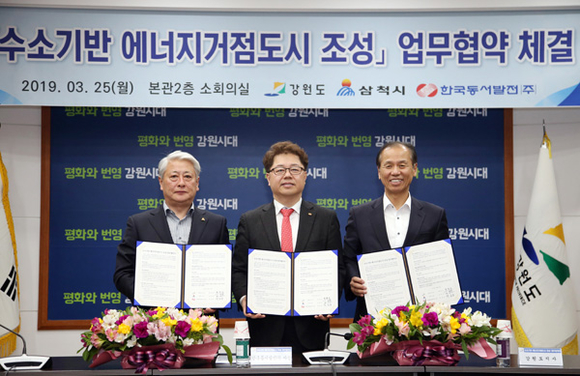 한국동서발전는 25일 15시 강원도청에서 최문순 강원도지사, 김양호 삼척시장이 참석한 가운데 삼척 대진원전 해제 예정 부지 활용을 위한 '수소기반 에너지거점 도시 조성' 협약을 체결했다고 밝혔다.