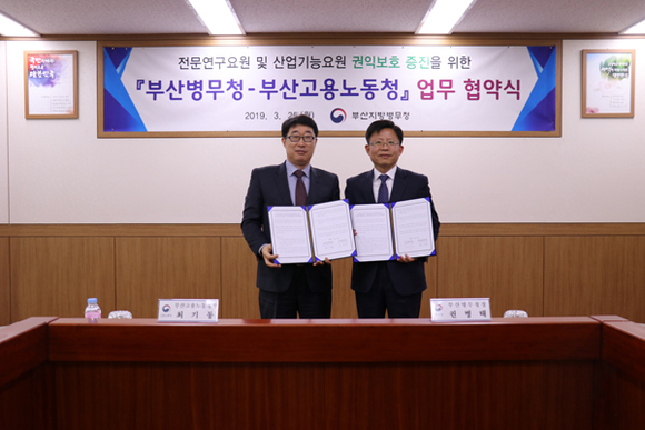 부산지방고용노동청과 부산지방병무청은 25일 병역대체복무를 하고 있는 전문연구요원 및 산업기능요원의 권익보호 증진을 위한 업무협약을 체결했다고 밝혔다.