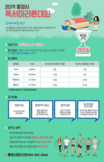 경남 통영시는 4월 1일부터 11월 30일까지 시민들의 독서문화 활성화를 위해 '독서마라톤 대회'를 개최한다.