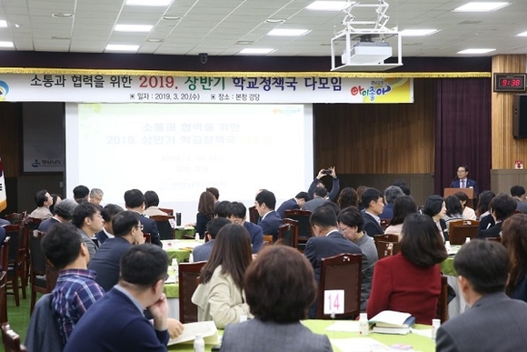 지난 20일에 열린 학교정책국, 미래교육국은 조직개편으로 인한 부서 및 담당 신설·조정에 관해 해당 부서의 전 직원과 교육감, 부교육감, 타부서의 장학관, 사무관도 참여해 주요 업무를 공유하고, 정책을 제안 받는 등 부서의 벽을 넘어 집단지성을 발휘한 것이 대표적인 사례다.