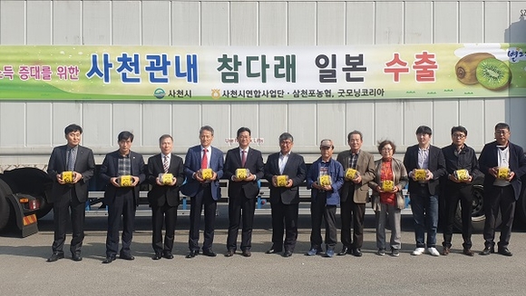 NH농협 사천시지부는 27일 삼천포농협 참다래 공선출하회 선별장에서 송도근 사천시장, 서준호 농협 사천시지부장, 이정실 삼천포농협조합장, 문길수 삼천포농협 공선출하회장 외 10여명이 참석한 가운데 사천 참다래를 일본으로 수출하기 위한 기념행사를 가졌다.