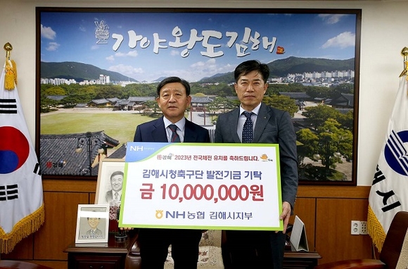 NH농협 김해시지부는 8일 김해시청을 방문해 시청축구단 후원금 1천만원을 구단주인 허성곤 시장에게 전달했다.