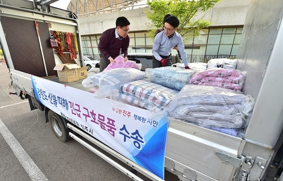 경남 진주시는 지난 8일 산불로 피해를 입은 강원도 주민들을 위해 긴급 구호물품으로 이불 150채, 세면도구 150세트 등을 전달했다고 9일 밝혔다.