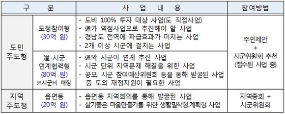 '도정참여형'은 전체 도민의 편익을 위한 사업으로 단위 사업당 5억원까지 총 30억원 규모로 운영하며, '도-시군 연계협력형'은 시군단위 지역문제 해결을 위한 사업으로 단위 사업당 3억 원까지 총 80억 원 규모로 운영한다.