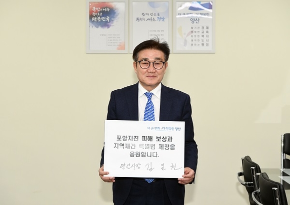 김 시장은 “포항지진 특별법 국민청원에 대한 국민들의 많은 관심과 참여를 부탁드리며, 지진으로 인해 힘든 포항시민들이 하루빨리 어려움을 털고 아픔을 치유하기 바란다”며 “양산시민들도 릴레이 캠페인에 적극 동참해주시기 부탁드린다”고 밝혔다.