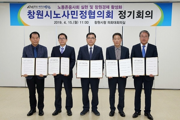 창원시 노사민정협의회는 15일 노사민정 대표들과 '노동존중사회 실현 및 창원경제 활성화를 위한 포용적 상생협약'을 체결했다.