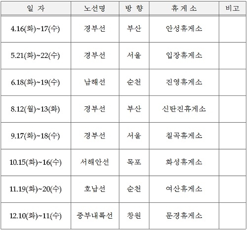 공사 관계자는 “정비 불량으로 인한 사고는 심각한 사고로 이어질 수 있어, 고속도로 운행 전 자동차 점검이 특히 중요하다”며 “연간 서비스 계획을 참고하여 해당노선을 운행할 계획이 있는 운전자들이 많이 이용하여 주시길 당부 드린다”고 말했다.