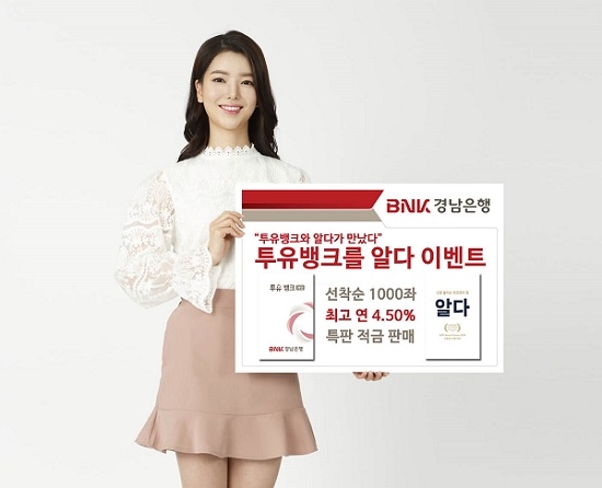 선착순 1000좌에 한정해 기본금리 1.70%, 경남은행 최초고객 1.0%p, 경남은행 입출금통장에서 이체 또는 자동이체시 0.80%p, 알다 리워드 혜택('알다'앱에서 발급받은 추천번호 입력) 1.0%p 등 최고 연 4.50% 금리가 제공되는 특판 적금을 판매한다.
