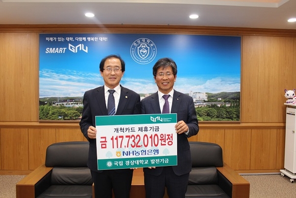 경상대-농협은행-비씨카드는 2005년 3월 업무제휴를 통해 교직원·학생·동문을 대상으로 개척카드를 발급하고, 카드 이용실적의 0.1~1.0%를 적립해 매년 발전기금으로 출연해 왔다. 농협은행은 2016년 1억 1221만여 원, 2017년 1억 1235만여 원, 2018년 1억 2295만여 원을 출연했으며 2006년부터 올해까지 총 10억 9806만여 원을 출연해 대학발전에 크게 기여했다.