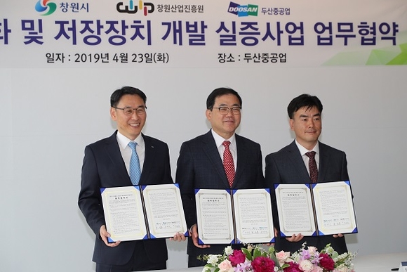 경남 창원시는 23일 두산중공업, 창원산업진흥원과 함께 '수소액화 및 저장장치 개발 실증사업' 추진을 위한 업무협약식을 가졌다.