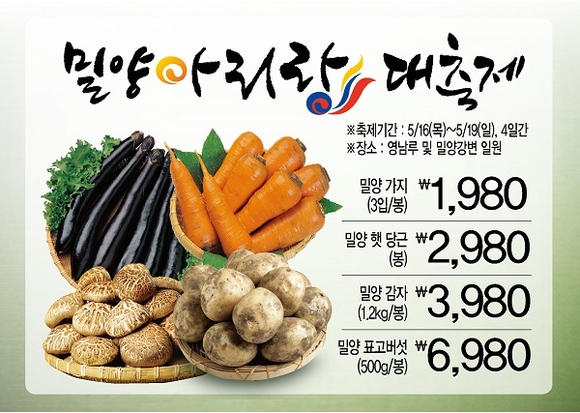경남 밀양시는 밀양아리랑대축제를 앞두고 전국 GS슈퍼 300여개 매장에서 오는 7일까지 밀양의 우수농산물(감자, 가지, 당근, 표고버섯) 특판 행사를 실시한다고 2일 밝혔다.