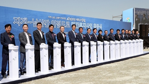 경남 창원시가 2일 동읍 남산리 공사현장에서 지개~남산간 연결도로 민간투자사업 착공식을 갖고 본격적인 공사에 들어갔다.