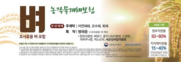 '벼' 보험은 태풍, 우박, 집중호우 등을 비롯한 자연재해와 조수해, 화재로 인한 피해를 보상받는다. 특히 올해부터 보험대상을 식용벼 뿐만 아니라 조사료용 벼까지 대상을 확대했으며, 기존 보장 병충해 6종에 세균성벼알마름병을 추가해 총 7종의 병해충을 보장한다.