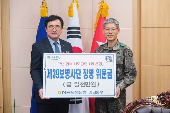 NH농협은행 경남영업본부는 지난 2일 제39보병사단 사령부에서 병영생활 개선과 장병 복지증진을 위한 위문금 1000만원을 기탁했다.