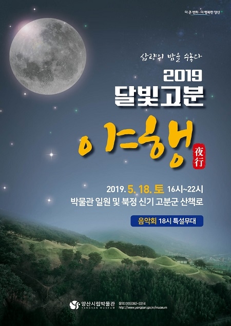 시립박물관 관계자는 “삽량의 역사를 간직한 고분의 낭만과 만월의 아름다움을 시민들과 함께 느낄 수 있는 뜻깊은 행사”라며 “오감으로 느끼며 은은한 달빛 아래 잊지 못할 시간이 될 것”이라고 말했다.