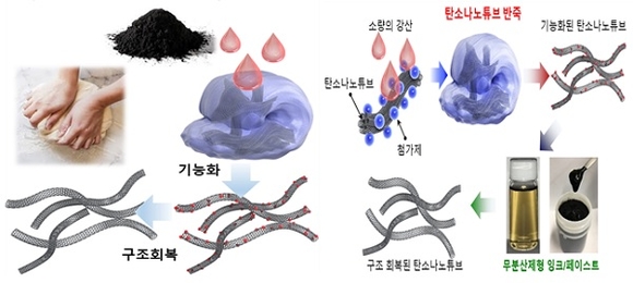 이러한 탄소나노소재를 분산제 없이 물이나 유기용매에 분산해 잉크나 페이스트를 제조하기 위해서는 그 표면에 용매와 친한 '기능기'를 도입해야 한다. 기능기는 화학반응에 관여하는 원자의 집단이다. 흔히 탄소나노소재를 기능화하는 대표적인 방법 중 하나로 질산이나 황산 같은 강산과 산화제를 첨가하는 것이 있지만, 이러한 방식은 소재에 심한 손상을 주게 되어 전도성이 낮아진다는 단점이 있었다. 또한 많은 양의 강산을 사용하다 보니 폐수처리 등 환경문제가 발생하기도 해 탄소나노소재 실용화에 큰 걸림돌이 돼왔다.