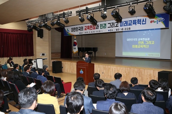 조희연 교육감은 이날 성명서 발표에 앞서 도교육청 공감홀에서 '대한민국의 교육현실과 인권, 그리고 미래교육혁신'이라는 주제로 강연을 가졌다. 조 교육감은 인권과 교육혁신의 관점에서 대한민국 교육의 문제점을 분석하고, 미래교육의 방향을 제시하는 담론으로 참석자들의 호응을 얻었다.