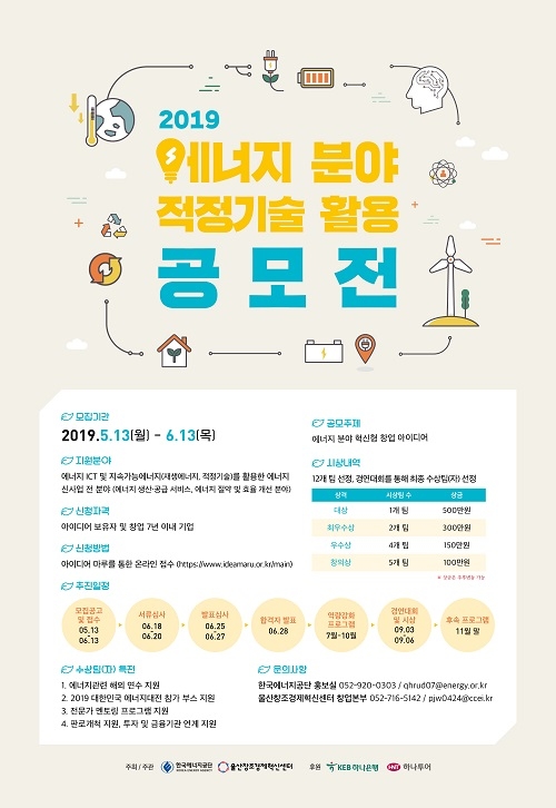 한국에너지공단이 13일부터 한 달간 다양한 방면에서 활용이 가능한 에너지 신기술 육성 및 신규 일자리 창출을 위해 에너지 분야 적정기술을 활용한 스타트업 모집 및 아이디어 제안 접수를 받는다.
