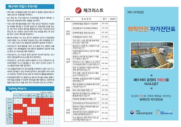 '화학안전 자가진단표'는 폐수처리업과 도금업의 각 공정별 유해·위험성을 분석하고 사고예방을 위해 작업 시 반드시 지켜야 할 주의사항과 작업자가 작업 시작 전 스스로 공정안전관리 상태를 체크해 안전하게 작업 할 수 있도록 도움을 주기 위해 제작됐다.