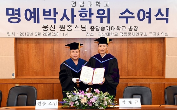 경남대학교는 28일 오전 11시 서울 극동문제연구소에서 중앙승가대학교 총장 원종스님에게 명예 행정학박사 학위를 수여했다.