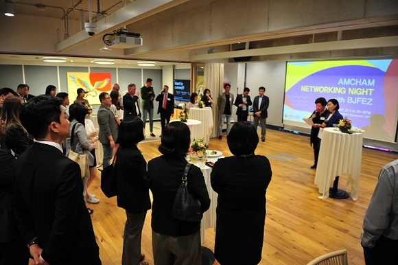 부산진해경제자유구역청은 지난 31일 부산 서면 위워크에서 주한미국상공회의소 회원 기업과 위워크 입주기업 등을 대상으로 투자유치 설명회를 가졌다.