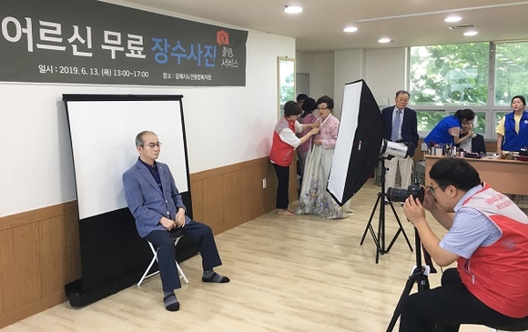 봉사자들은 카메라와 조명 등 촬영 장비를 직접 설치한 뒤 장수사진을 신청한 어르신 50여명에게 사진을 찍어줬다.