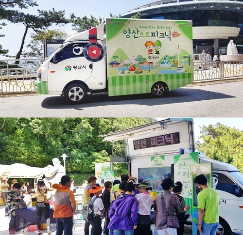 양산 이동식 차량 홍보관은 '양산으로 피크닉'의 주제로 양산 관광 이미지로 랩핑한 차량으로 이동, 한국관광공사가 선정한 관광벤처기업 여행아이큐가 '나의 양산 피크닉 지수는 몇 점?' 모바일 플랫폼을 이용하여 터치스크린 키오스크 이벤트를 진행해 양산의 명소와 대표 음식 등을 소개할 예정이다.