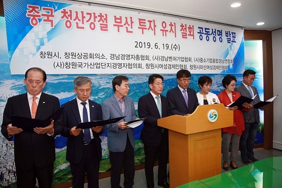 창원시, 창원상공회의소, 경남경영자총협회, 경남벤처기업협회, 중소기업융합경남연합회, 창원국가산업단지경영자협의회, 창원시여성경제인협회, 창원시마산여성경제인협회는 이날 창원시청 프레스센터에서 기자회견을 열고 부산시의 중국 청산강철 투자 유치 철회에 대한 공동성명을 발표했다.
