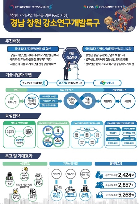 또 강소특구 연구지원사업을 통해 스마트산단 등 산업구조고도화에 필요한 핵심기술을 이전하여 제조업 혁신을 추진하고, KERI가 보유한 전기/전력·에너지·전기추진·로봇·나노융합·의료기기 등 4차 산업혁명 시대를 주도할 첨단산업 관련 연구성과를 창원국가산단 내 지역기업에 이식시켜 지속성장이 가능한 산업단지로 육성한다는 목표다.