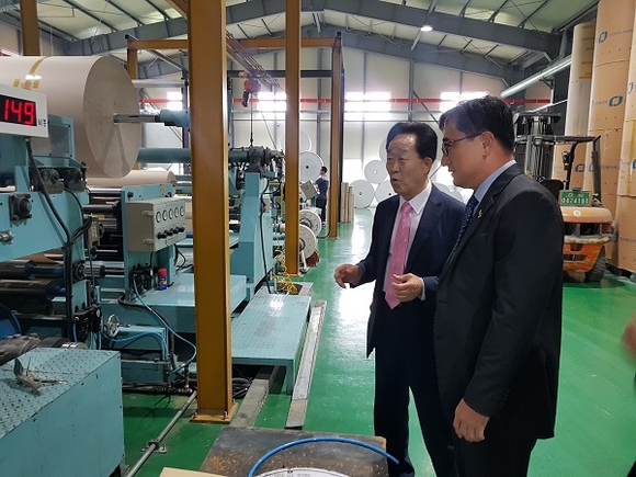 김한술 NH농협은행 경남영업본부장이 24일 김해시 진례면에 소재한 골판지 제조업체인 ㈜신진팩을 방문해 스마트공장 구축 현황을 점검하고, 성공적인 스마트공장 시스템 구축을 위한 여신 지원 방안을 논의했다.