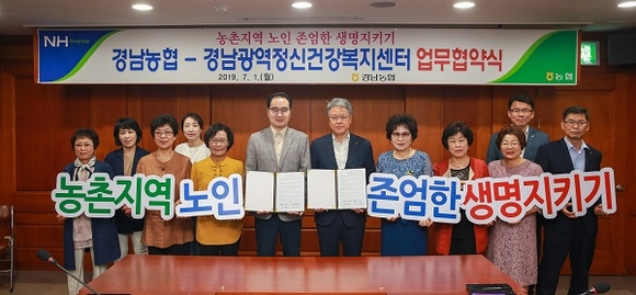 경남농협과 경남광역정신건강복지센터는 1일 경남농협 대의원회의실에서 '농촌지역 노인 존엄한 생명 지키기' 협약을 전국 최초로 체결, 지역사회 내 존엄한 생명영위의 중요성 인식 확산 및 자살예방과 정신건강증진을 위해 상호 협력키로 했다.
