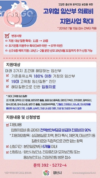 양산시보건소는 오는 15일부터 정부 주도 고위험임산부 의료비 지원사업의 대상 질환 및 기간을 확대한다고 9일 밝혔다.