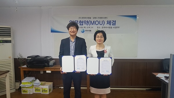 김해시자원봉사센터는 9일 부원동 소재 사회적기업 ㈜문화와 사람들에서 자원봉사와 지역문화 활성화를 위한 업무협약을 체결했다.