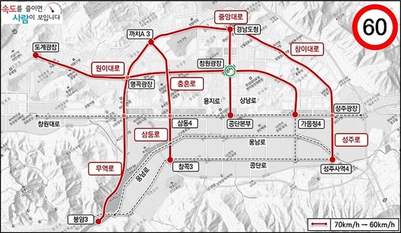 경남 창원시는 지난해 말 시 도심부도로 제한속도를 70km/h에서 60km/h로 하향조정을 실시해 교통사고 예방에 큰 효과를 거뒀다고 11일 밝혔다.