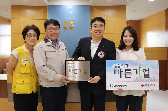 경남에너지는 대한적십자사의 월 50만 원 정기 후원 회원으로 가입해 대한적십자사 경남지사와 지난 25일 '씀씀이가 바른기업' 19호점 명패 전달식을 가졌다.