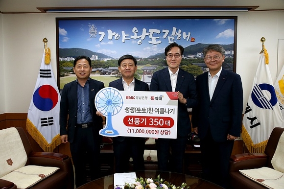 BNK경남은행 사랑나눔재단은 1일 김해시를 방문해 관내 어려운 이웃들에게 전달해 달라며 1100만원 상당의 선풍기 350대를 기탁했다.