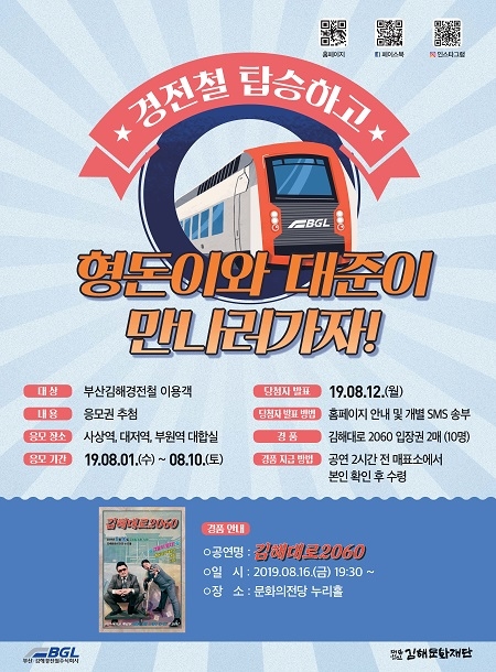 경품으로는 경전철 제휴사 김해문화재단의 '김해대로 2060' 입장권 2매가 제공된다. '김해대로 2060'은 무더위를 책임질 형돈이와 대준이의 스탠딩 콘서트로, 오는 16일 오후 7시 30분에 김해문화의전당 누리홀에서 열린다.