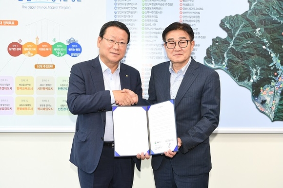김일권 양산시장과 최삼섭 ㈜대원플러스그룹 회장은 7일 양산시청 상황실에서 이런 내용을 담은 '양산 신기2지구 도시개발 업무협약'을 체결했다.