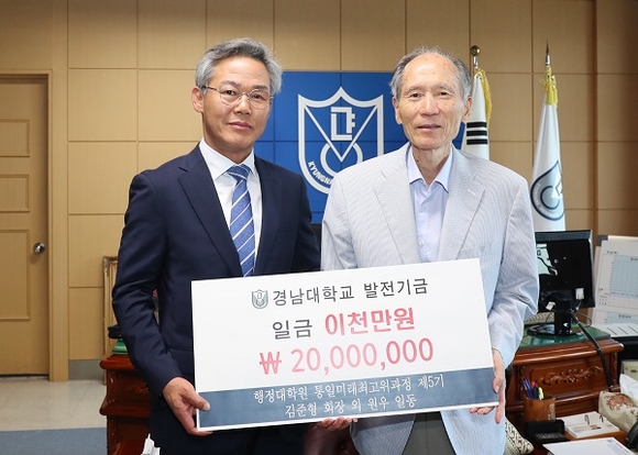 경남대학교 행정대학원 통일미래최고위과정 5기 학생회가 7일 모교의 대학발전기금으로 2000만 원을 쾌척했다.