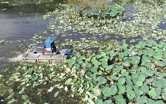 이번 연 제거 사업은 이달부터 10월까지 약 3개월간 집중 운영되는데, 수초제거선 앞에 부착한 절단기를 이용해 수면 아래 최대 1m 부분의 연 줄기를 절취함으로써 줄기 내 침수를 유발해 연 개체를 고사시키고 곁가지를 통해 재 발아하는 연꽃은 같은 작업을 반복함으로써 연 제거가 진행된다.