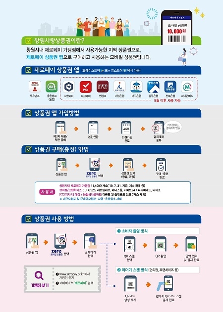 창원시내 제로페이 가맹점(동네슈퍼, 학원, 음식점, 이·미용실 등, 7월 말 기준 1만 1433여개)과 편의점(CU, GS25, 세븐일레븐, 미니스톱, 이마트24), 프렌차이즈(파리바게뜨, 다이소), 농협하나로마트(대규모, 준대규모 지정점포 7개소 제외) 등에서 사용할 수 있다.