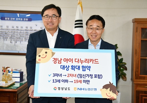 경남도와 NH농협은행은 21일 도청에서 도내 다자녀가정의 양육비 경감 및 임신·출산·양육 친화환경 조성을 위해 경남 다자녀가정 우대카드 대상 확대 업무협약을 맺었다.