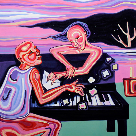 김하슬 작가는 현실이라는 한정된 공간에서 벗어나 자유로운 상상의 공간을 펼쳐낸다. 작가는 자신과 주변의 소소한 일상에서 영감을 받아 개인의 감정, 추억, 기억 등 작은 소재로 새로운 상상의 이미지를 만들어 낸다. 색은 감정을 나타내는 매개체로, 화면은 다양한 음악을 들려주는 무대로 탈바꿈된다. 무희의 춤사위, 나팔을 부는 아이들, 부유하는 꽃을 보고 있노라면 삶에 대한 두려움은 사라지고 어떠한 걱정도 다 없어지는 듯하다.